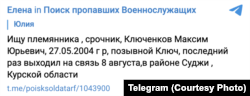 "Ищу племянника, срочник, Ключенков Максим Юрьевич, 27.05.2004 г. р., позывной "Ключ", последний раз выходил на связь 8 августа в районе Суджи Курской области", — писала она.